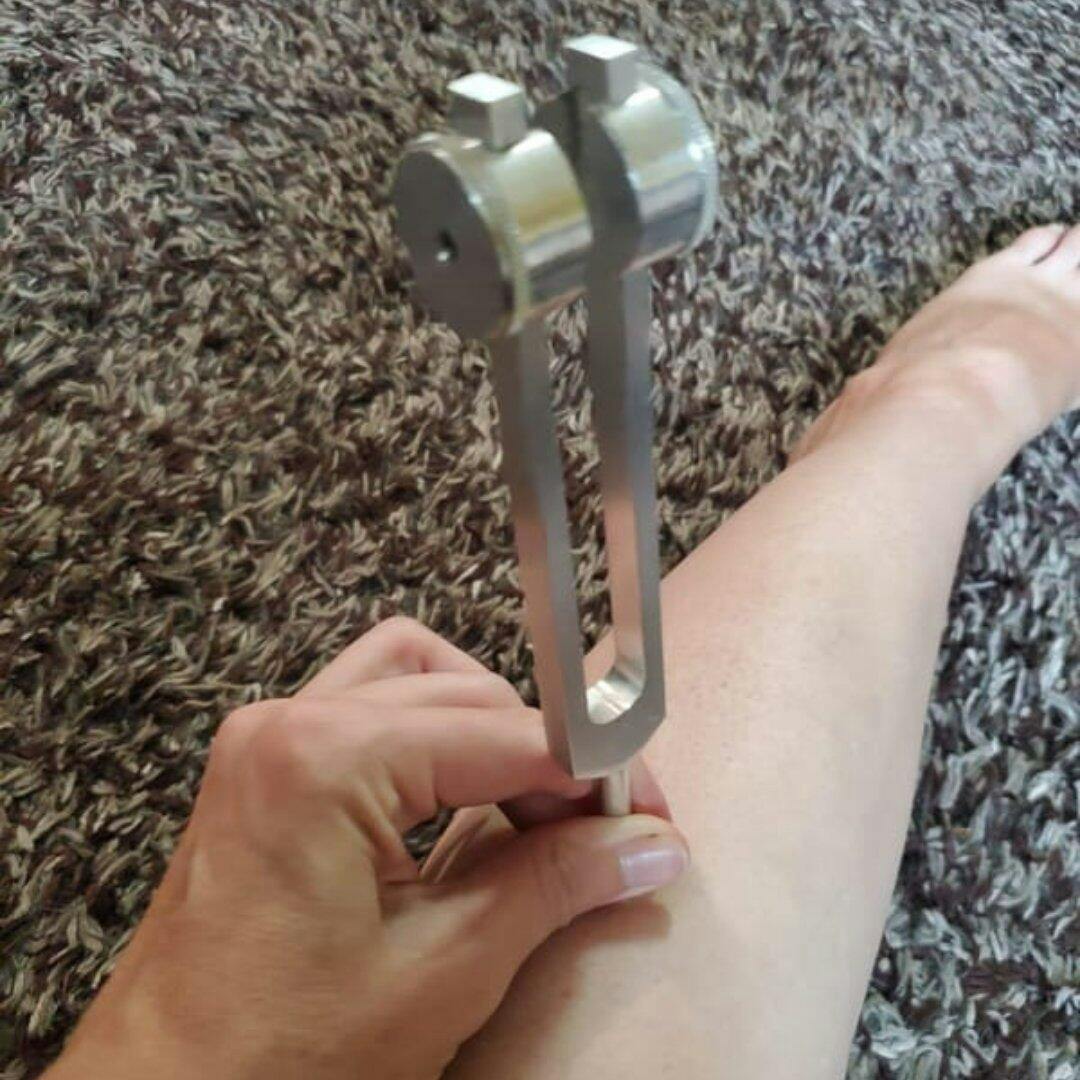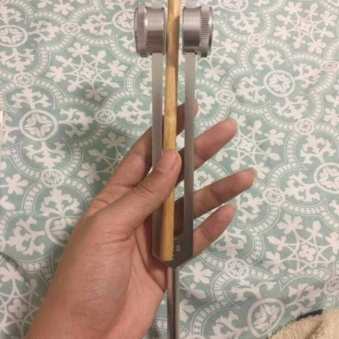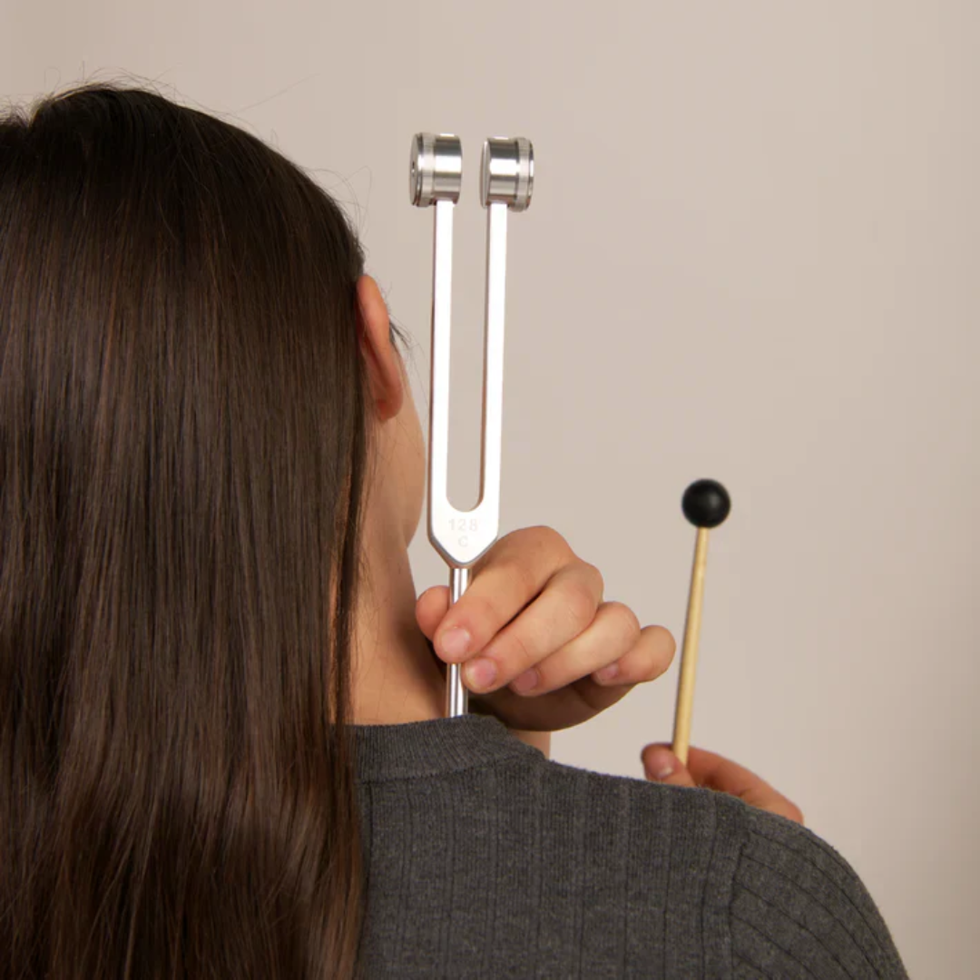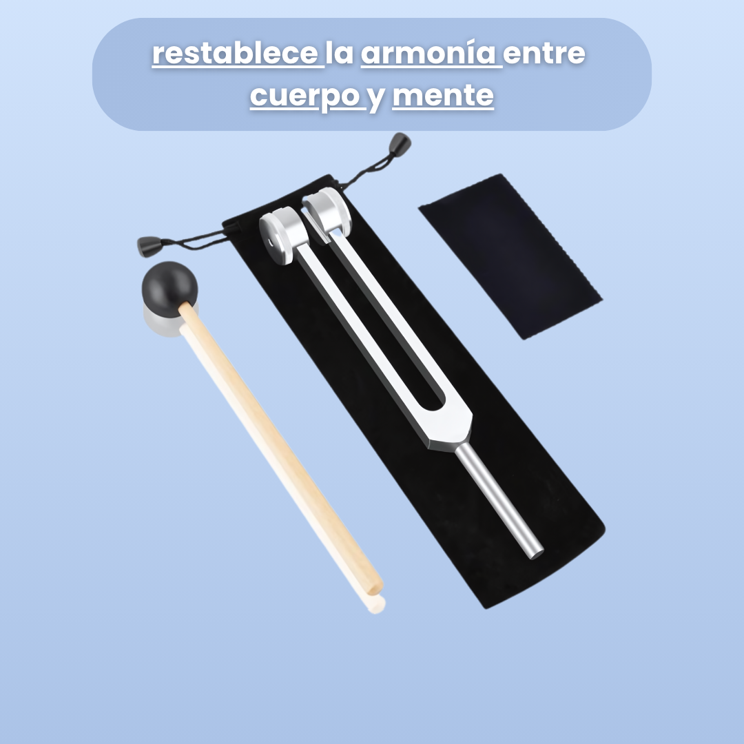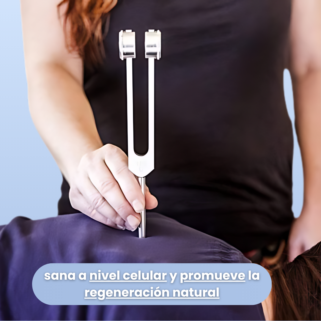 Al golpearlo suavemente con el martillo, comienza a emitir una frecuencia de 128 Hz que genera ondas vibracionales terapéuticas.